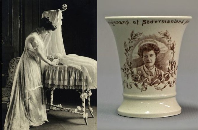 Maria Pavlovna med sin son Lennart, vykort från 1909. Porslinsbägare med porträtt av Maria, hertiginna av Sörmland.