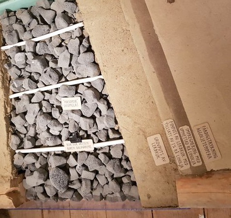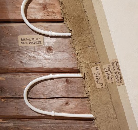 Stengrunden har noggrant lufttätats med lerbruk innan uppfyllning med skumglas, Hasopor. Det är ett mineraliskt, fuktokänsligt, kapillärbrytande isolermaterial som är tillverkat av returglas. Isolertjockleken bör vara minst 30 cm och läggs direkt på marken. På isoleringen har vattenburna golvvärmeslingor lagts ut innan golvet putsats med lerbruk. När första grovputslagret torkat igenom har ytputsen strukits ut i ett centimetertjockt lager. Ytputsen är ett lerbruk med tillsats av 1 % linolja som efter torkning impregnerats med uppvärmd linolja varefter den målats med äggoljetempera.