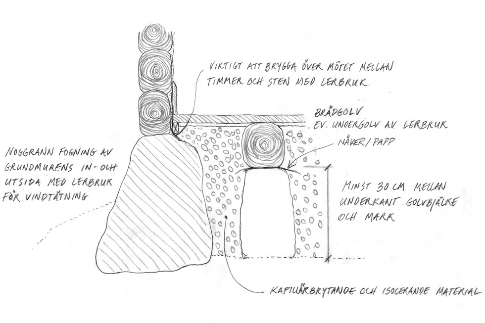 Byggnader utan källare är ofta byggda med höga torpargrunder och har en sockel av naturstenar. Dessa murades utan murbruk eller med kalkbruk. Det är vanligt att murarna i senare tid lagats med cementblandat murbruk. Detta är stelt och följer inte husets rörelser. Därför ska cementbruket helst tas bort och ersättas med lerbruk eller kalkbruk.